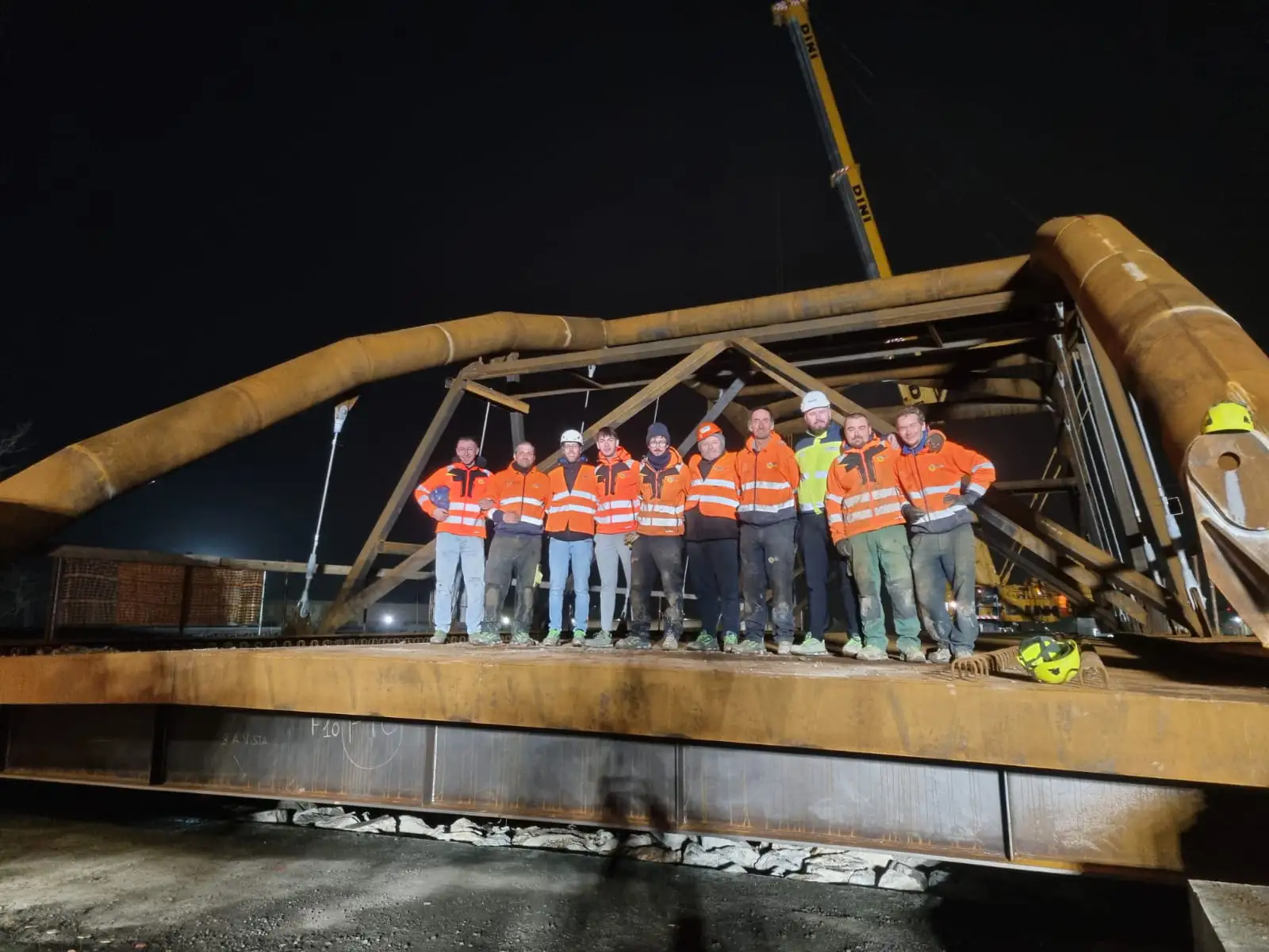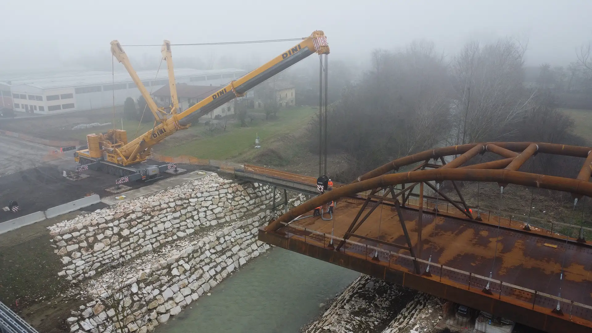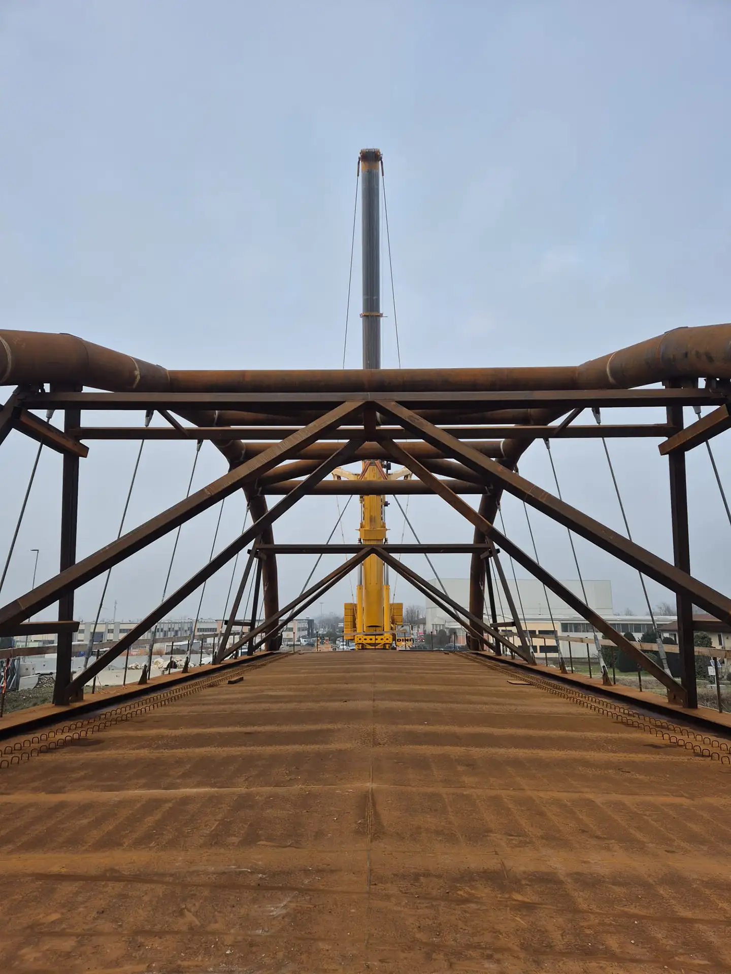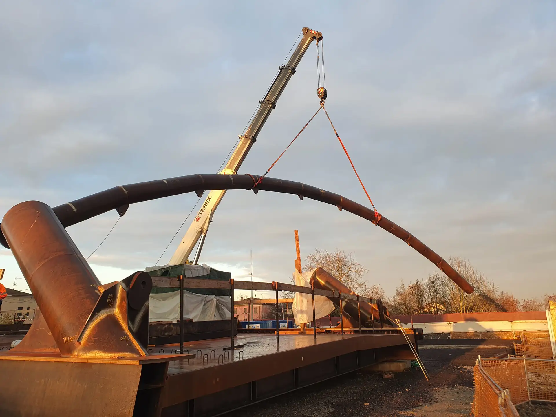 Il montaggio del ponte è avvenuto in area limitrofa al punto finale di posa; qui tutti gli elementi sono stati posizionati e saldati in opera con saldature in larga parte controllate con controlli non distruttivi (visivo, magnetoscopico e ultrasonoro).