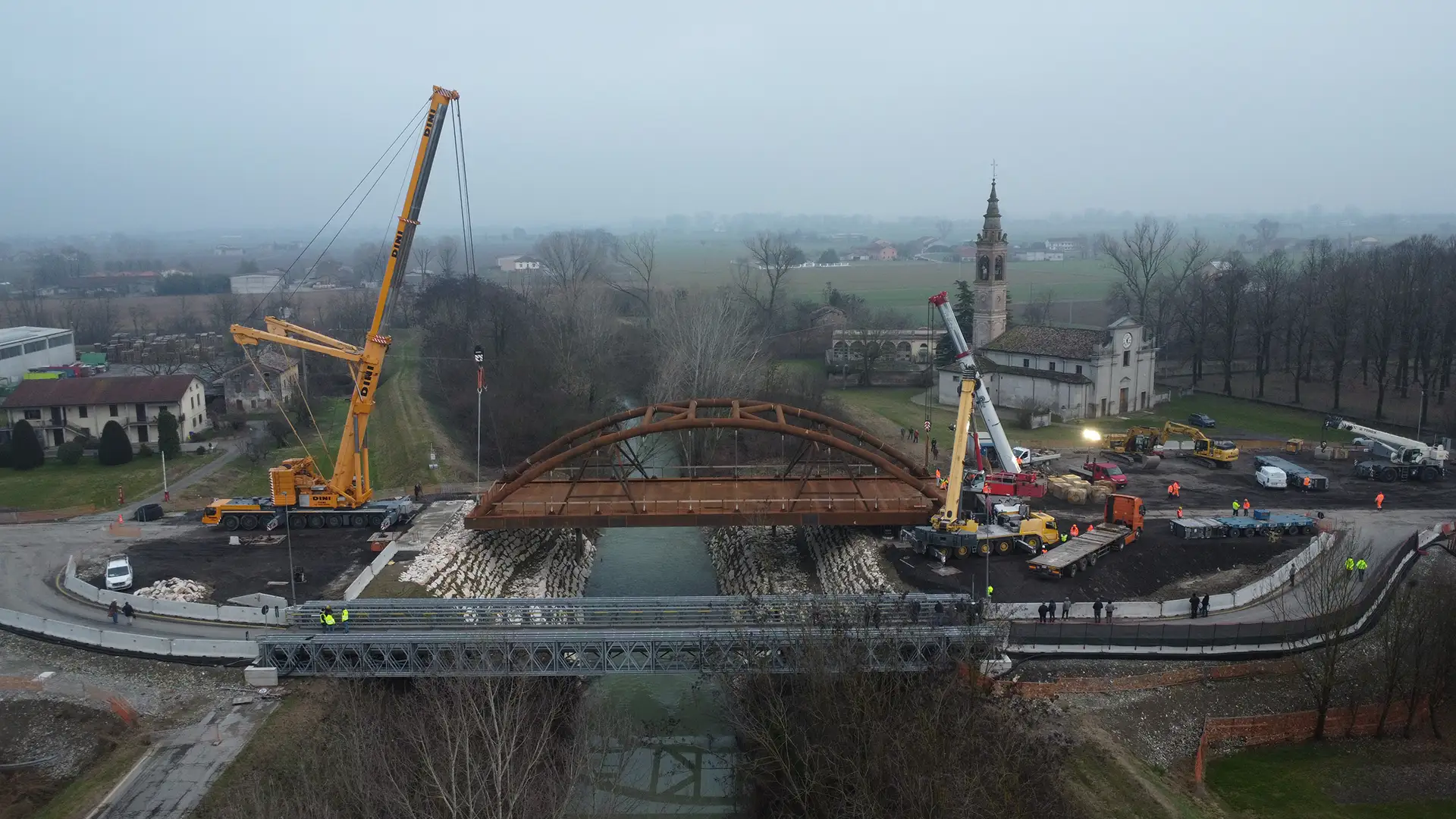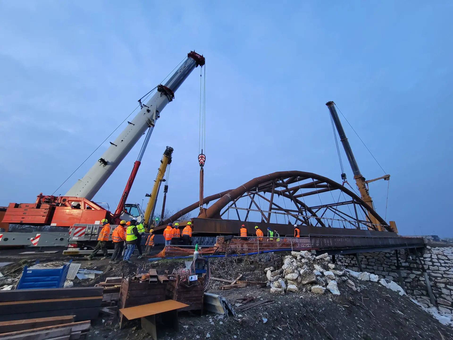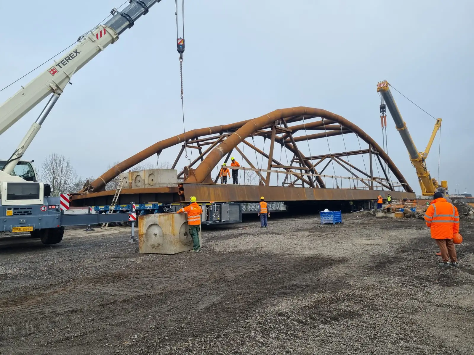 Il ponte completo è stato infine spostato al punto di posa mediante carrelli SPMT, fatto scorrere su slitte e sollevato simultaneamente con l’ausilio di Nr. 3 autogrù da 500, 250 e 130 ton.
