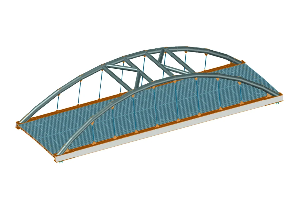 La struttura, interamente realizzata in acciaio cor-ten, ha dimensioni di 43 mt x 13,86 mt ed altezza 9 mt, la tipologia è “ad arco” con lastra ortotropa e pendini in fune.